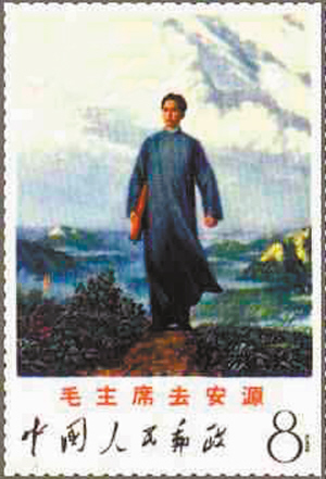 1968年8月1日,中國(guó)發(fā)行了一枚面值8分的郵票,是根據(jù)《毛主席去安源》的油畫設(shè)計(jì)的。圖中,毛澤東身穿藍(lán)布長(zhǎng)衫,手拿雨傘,在烏云翻滾的天空下凝神走來,非常形象傳神。