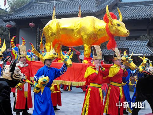 “從農歷初一到十五,宋城新春大廟會即將隆重啟幕!薮虼号!@個活動就是為了讓更多的市民了解所用的‘金!翘貏e從外地訂做的,身長三尺六寸五,象征一年365天;牛尾長一尺二寸,象征一年12個月。單單牛頭就長80公分,十分地高大威猛,將勞動八個大漢才能將其抬出來。”杭州宋城景區的有關負責人介紹說。