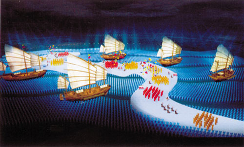 廣東團隊9人分頭醞釀構思后,集中在南海里水的一家賓館“封閉”。某天,陳中秋、謝曉泳和黃力生站在賓館房間陽臺冥思苦想,突然靈機一動:地面不也可以變成“熒屏”嗎?如果把整個場館的地面變成一個LED的大屏幕,可按要求不斷變換逼真的圖像,團體操隊員和演員在“地熒屏”上表演,圖像、色彩完全和演出能融為一體。