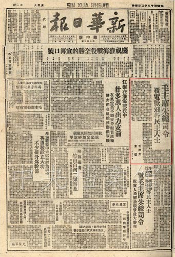 3.1949年2月5日,《新華日報》發表的毛主席朱總司令歡迎各民主人士的復電
