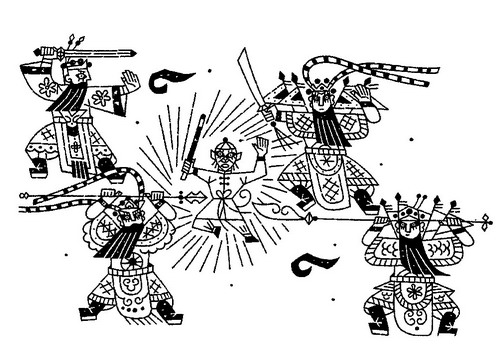 這些,只要看看他的《美猴王》插圖系列,就十分清楚。該系列作于上世紀50年代末60年代初期,當時,在縝密的研究準備之后,斯科納創作了80幅水墨章首尾插圖和24幅全頁彩色插圖,簡樸的水墨畫順合故事的發展,而彩色插圖則對文本進行了繪畫藝術的改編。斯科納為此研究出專門的很復雜的技巧,采用多種創作方法和顏料,以表現出故事的景象和意義。為了達到最好的藝術效果,他經常把空間劃分為幾個部分,由此反映幻想內容與精密藝術描寫的對比。除此之外,斯科納的其他繪畫元素,如中國的佛像、飛天、天兵天將、孔子、孟子、楚霸王、司馬遷等等,也循此嘗試慢慢展開。幸運的是,本畫展集中展示了茲德涅克·斯科納教授在中國創作的這批藝術珍品。