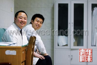 在整容室里,因為同齡,張洋和張祺關系很好。張祺相對活潑點,他跟張洋講起昨晚做過一個夢,夢見一哥們掉水里了。在夢里他哈哈地樂著!鞍滋觳荒苄,晚上做夢才能笑!睆堨靼腴_玩笑地說。有時候,哥倆做久了這份工作也感到壓抑,晚上必須找朋友喝酒。朋友都會好奇他們的工作,都覺得怎么也得一月上萬。張洋跟記者嚴肅澄清:真的只有3000多,非常普通的工資標準。