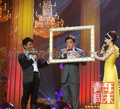 這時(shí),一段比賽舞蹈結(jié)束,該三個(gè)主持人一起上臺(tái)了,忽然找不到了吳宗憲,只聽年輕的女主持人著急得有些變了腔調(diào):“憲哥!憲哥快上!”趙忠祥手握話筒拉了一下女主持人,聲音沉穩(wěn)地說:“不著急,不著急。”吳宗憲飛快地從暗處跑出,合上手機(jī),三人整了一下裝,穩(wěn)步上臺(tái)。