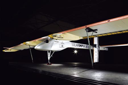 6 月26 日,伯特蘭·皮卡特在瑞士的蘇黎世機(jī)場,向人們展示了這架依靠太陽能作為全部動力的飛機(jī)。這架飛機(jī)看上過去纖巧、修長,機(jī)翼和尾翼上都蒙覆了一層薄膜一般的太陽能電池板。這些電池板將把陽光轉(zhuǎn)化為電能,不僅能讓飛機(jī)在白天持續(xù)飛行,在夜間,被電池板儲存下來的能量也能支持飛機(jī)繼續(xù)它的行程。