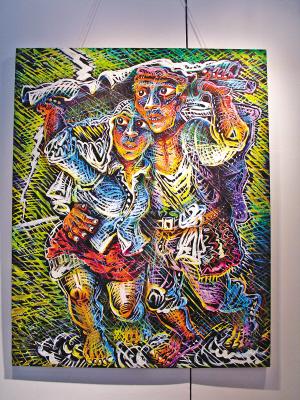 據介紹,在120位參展藝術家中,就有13位重慶藝術家,除了羅中立、傅文俊、李一凡三位參加主題展的藝術家外,還有10位來自川美的藝術家進入了新人特區展。羅中立四幅最新力作首次展出也是雙年展另一個焦點。昨日,記者在現場看到,羅中立的四幅作品分別是《下梯的農婦》、《過河系列一》、《吹燈》、《雷雨》,內容都圍繞鄉村愛情。但在昨日的開幕儀式上,羅中立和陳丹青都因故沒有出席。