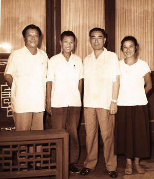 1961年7月初,我們在北京工作的堂兄爾輝結(jié)婚,因為他祖母和母親都在淮安老家,伯伯和七媽為他們在西花廳舉辦了婚禮,飯前參加婚禮的三十多人一起照了相,我去晚了沒趕上。飯后,七媽拉住我說:“你來晚了,沒趕上照相,又要參軍走了,來和伯伯照個相吧。”維世姐姐說:“金山也來晚了,一起照吧。”于是有了上面的這張照片。