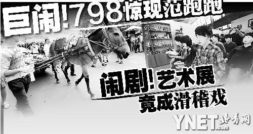 隨后,更多的“作品”給昨日的798平添了不少熱鬧——有趕馬車稱“驢子當代藝術協會”的,有推小車賣尿壺稱“為人民服務”的,還有蒙上黑頭套逮誰就問“誰能告訴我廁所在哪兒”的……這場面倒是響應了雙年展此前提出的“人人都是藝術家”的口號。不過,記者從路邊一位不停抱怨的候補藝術家處得知,這些“創作”在開幕前的一刻都說不算數了,因為這個單元的策展人突然宣布退出雙年展,也就是說以上的現場行為表演都不再是雙年展的組成部分,而他本人是一位律師,本來準備搞個現場法律咨詢,“這也是我的作品啊,但是現在不想實施了。”