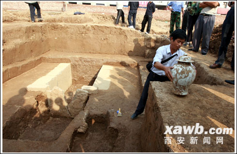 在地宮墓葬南側(cè)約4米遠(yuǎn),考古人員還發(fā)掘出一個(gè)更為少見的墓葬。這是一個(gè)距現(xiàn)地表約1米深的長(zhǎng)方形豎穴墓坑,長(zhǎng)約1.5米,寬約0.8米,其內(nèi)置放一個(gè)高約70厘米、直徑約80厘米的大陶缸,缸口用一大陶盆覆蓋,內(nèi)中有一具呈盤坐姿態(tài)的完整骨架,周圍填有木炭屑及麥草等。張全民介紹說,這是一個(gè)僧人的坐化真身,即其彌留之際以盤坐姿待逝,留下完整尸身歸葬。其葬式也可稱甕棺葬,所填充的木炭等物用以吸潮防腐,也確實(shí)起到了作用。
