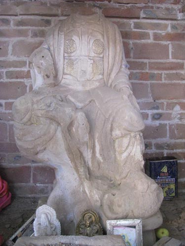據(jù)國家文物局網(wǎng)站消息,該造像砂石圓雕,頭已殘失,高120厘米,寬65厘米,厚50厘米,坐于樹根狀座上,左腿自然下垂,跣足踏一類似玄武的物體,左手平置于左膝,右腿上屈置于座面上,右腳殘缺。坐姿類似于觀音的游戲坐,披發(fā)跣足,外著大衣,內(nèi)著鎧甲,胸部為人字形護心鏡,胸系絆帶,腰扎英雄巾。座后方刻凌亂文字數(shù)行,大多已漫漶不可辨識,依稀可見“神□七年”、“正大二□”等。