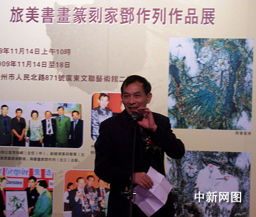中新網廣州11月14日電(記者 莫非 通訊員 葉藍)旅居美國西雅圖著名書畫篆刻家鄧作列書畫藝術作品展,于2009年11月14日至18日在廣東文聯藝術館舉行,當地僑界與藝術界負責人和書畫藝術家、各界友好人士逾百人參加開幕典禮。