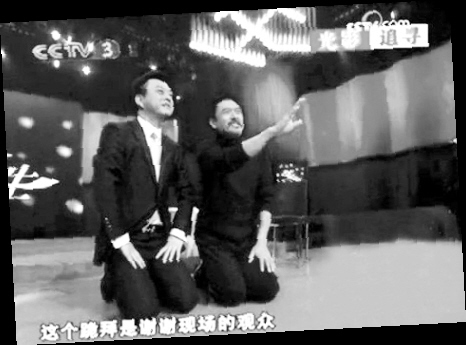 周潤發(突然拉著朱軍,面對現場觀眾跪了下來):讓你感受一下《孔子》是如何復原兩千年前的真實生活的。(接著以額貼地,實實在在地給觀眾叩了一個頭)這個跪拜是謝謝現場的觀眾。