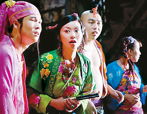 其一,全片表現以“鬧劇”式的敘事假定性(擬古而又將年代模糊化,中英語錯雜使用),劇中角色一個個俱成了從屬于“無厘頭化”情節進程的符碼,遺去原版人物之“神”而僅存其形、其皮,全都平庸而了無新意。諸如張三、李四、王麻子再饒上兩個添油加醋的小小伙計趙六與陳七(毛毛扮演)。花上200萬美金買來的這個版權,如此做法,不但堪稱極盡奢侈的浪費,同時也標示了主創者創意能力的喪失而淪為匠藝般的“東施效顰”。