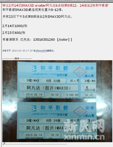 2月14日阿凡達IMAX票已炒至1000元!和平影都2月影票自1月29日開售起,便掀起新一輪購票狂潮。新民網記者近日在各大論壇及購物網站上看到,2月份影票大多已飆至500元,2月14日晚6點場次已炒至1000元。對此,和平影都總經理王伯政表示:“‘黃牛’不得了,這也不是我能管的。”