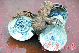 記者了解到,古沉船經(jīng)清淤后現(xiàn)身的3組木質(zhì)隔艙板位于沉船中部,其中一塊已經(jīng)現(xiàn)出約4米長的一段。隔艙板之間,已能夠清晰看到碼放整齊的一摞摞瓷器等文物。成摞瓷器基本上都是側(cè)立橫放并交錯碼放。考古隊員在水下見到的文物種類主要是青花瓷大盤,也有少量碗、缽、杯及金屬凝結(jié)物。而目前已出水文物主要類型也仍然是外銷瓷器青花瓷大盤、碗、缽、杯、罐、瓶等,此外還有釉陶罐、鐵鍋及銅板等。瓷器的主要產(chǎn)地確定為福建平和窯及江西景德鎮(zhèn)。