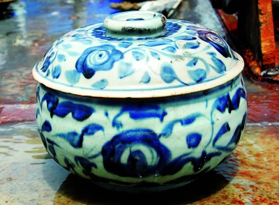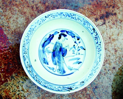 目前見到的文物種類主要是青花瓷大盤,此外也有青花瓷缽、青花小酒杯、青花碗、貼塑龍紋罐、銅板、鐵器及金屬凝結物等等。崔勇介紹,其中青花瓷大盤和帶蓋青花瓷缽是有代表性的器物,瓷胎和釉質比較厚重,青花顏色不太鮮亮,發灰或者發黑,無論人物還是花草圖案都比較隨意,器表施滿釉,底足粘有細砂,即“砂足器”,屬于外銷瓷中的常見類型。