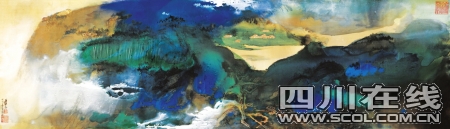 《愛痕湖》為張大千1968年所作巨幅絹本潑彩,寬76.2厘米,長264.2厘米,畫面描繪的是遠眺瑞士亞琛湖所見,與張大千平生巨構《長江萬里圖》創作于同年,為張大千《愛痕湖》系列中最精彩、尺寸最大的一幅。該作品于20世紀60年代曾獲展于紐約、波士頓、芝加哥等地的著名畫廊,2003年又獲展于紐約大都會博物館《兩種文化之間》大型中國現代藝術展,是藝術史界共認的張大千潑彩山水最精彩的作品。畫面前景為青翠的山巒,后景則一泓湖水,掩映其間,又有淡墨、淡彩勾勒的屋舍。這是張大千化用西方抽象派藝術與中國傳統文人藝術的水乳交融之作,也是以現代的語言,對北宋雄偉山水的現代性翻譯,不僅是張大千的藝術臻于化境的象征,也是中國傳統藝術最成功的“現代性突圍”。
