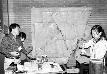 來自陜西唐大明宮遺址文物保護(hù)基金會的赴美代表和隨團記者以及美方專家,共同見證了這一時刻。據(jù)西安專家組組長楊文宗介紹:今天主要進(jìn)行的是補全工作,補全是文物修復(fù)工作中比較重要的環(huán)節(jié),在上一周及前期在國內(nèi)大量實驗工作的基礎(chǔ)上,終于開始了補全工作的實施。前期試驗段主要包括修補材料的選擇、采用工藝的確定等工作,待實驗結(jié)束后,中美雙方專家就實施方案進(jìn)行了最終的敲定。今天的補全工作首先是使用加固劑對斷面進(jìn)行加固,其次是調(diào)制修補用的填補材料。今日開始,修補的部位主要為拳毛騧表面橫向出現(xiàn)的3條裂縫,約3.5米,颯露紫右下角、拳毛騧左下中部、左側(cè)面等幾處缺失做了填充修補。