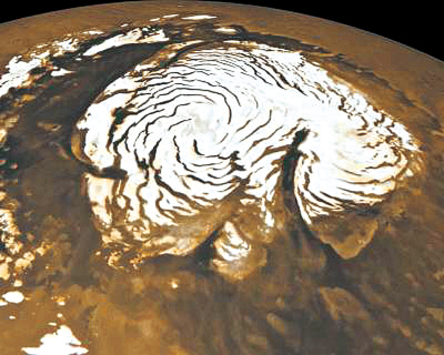 火星北極冰冠由冰和塵土層組成,厚約3000多米,覆蓋的面積略大于美國德州的面積。1972年,科學(xué)家觀察到了火星北極冰冠深谷和多螺旋低谷的地質(zhì)特征,并對它們的形成進(jìn)行了推測。