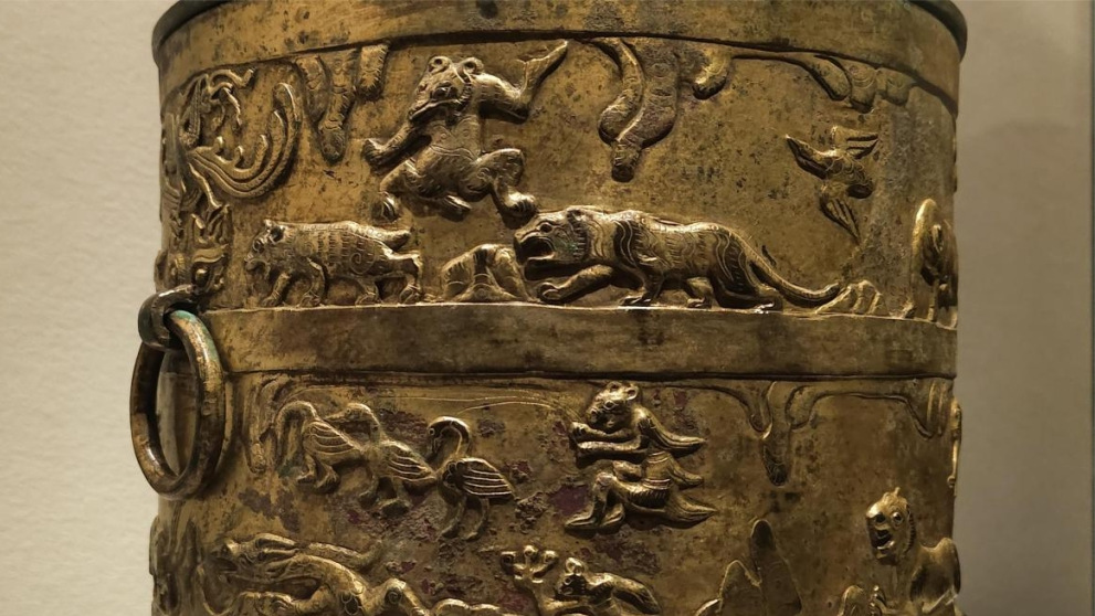 在山西博物院的“民族熔爐”展廳內,一對光彩奪目的鎏金銅樽引人注目。是什么原因使得中原元素與草原風情同時出現在這件銅樽上?