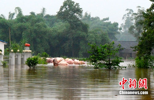 18日早上,中新網(wǎng)記者在受災嚴重的重慶潼南柏梓鎮(zhèn)看到,雖然雨已經(jīng)停歇,但鎮(zhèn)上的洪水仍未褪去,多條街道的積水仍有半人深。洪水完全包圍了當?shù)氐囊粋養(yǎng)豬場,近百頭被淹的活豬成片浮在水面上,據(jù)該場工作人員介紹,該豬場養(yǎng)的6000多頭豬均被洪水淹沒,僅17日便死了1000多頭豬。因豬場受困之處水位較深無法救援,豬場場主只能眼睜睜看著豬被洪水沖擊漂浮。