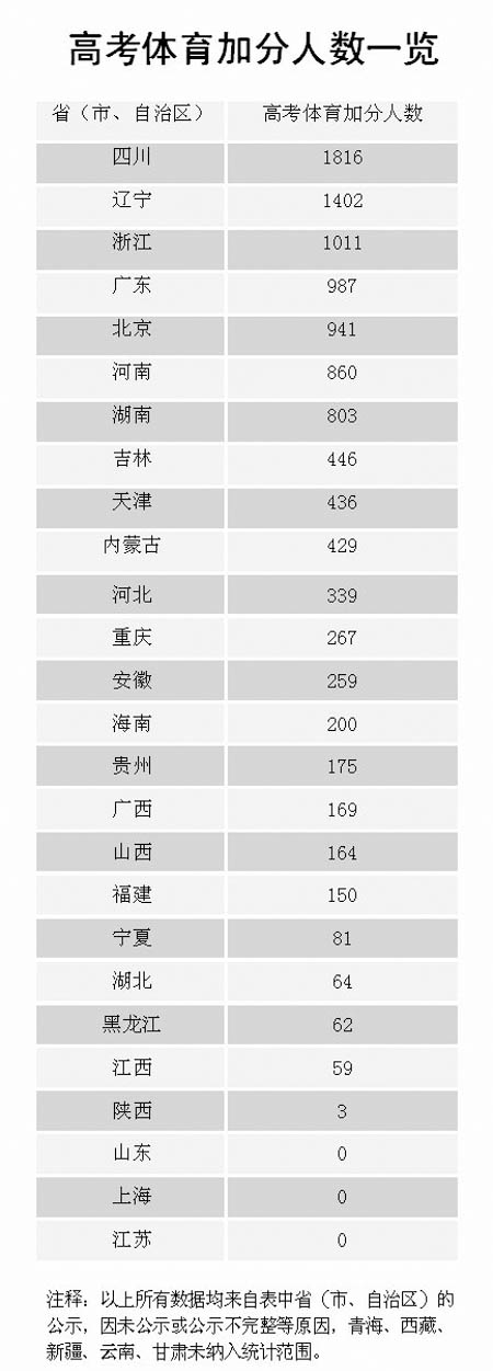 很多省份對體育加分項目并沒有做出詳細說明,如福建、吉林,只標明了“經(jīng)省教育廳、體育局認定的國家二級以上運動員”;天津、新疆也未明晰具體體育項目。貴州和河南也只是簡單地區(qū)分了“重大體育比賽”及“國家二級運動員(含)以上”。 實習生 周薇