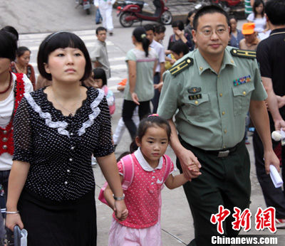 內江好心叔叔阿姨送玉樹災區6歲小夢雅去新學校報名。 王偉 攝