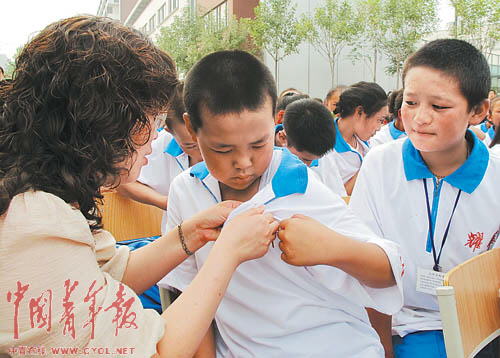 今天(5日),青海省玉樹縣12歲的藏族學生更尕求占,在天津開始了自己的初中生活。接收她的天津市東麗區耀華濱海學校為共計563名玉樹學生舉行了開學典禮,他們當中絕大多數是藏族學生。5個月前,他們的學業和生活被突如其來的地震打斷。