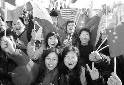 圖為北加州的中國留學生為奧運圣火傳遞搖旗吶喊。