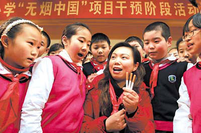 老師在教室、走廊等公共場所吸煙,將受到扣獎金等系列處罰。昨日,我市首個“無煙學!眲摻ɑ顒釉谏汉鲗嶒炐W正式啟動,該校校長邀請全體同學積極參與控煙行動,并隨時監督和舉報老師的不文明吸煙行為。