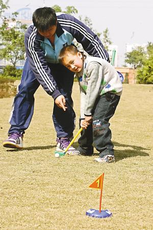 “我揮了半天,終于進洞了。”10名二年級的小學生正在體育教師李科的帶領下進行高爾夫球訓練。這些孩子拿的高爾夫球桿是一根大約長30厘米的塑料桿,另外還有15個紅、藍色球洞分置在草坪四周。