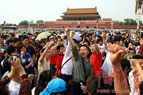5月19日下午,天安門廣場上聚集了數萬名參與哀悼活動的群眾,在默哀完畢后,此起彼伏的“中國萬歲”、“中國加油”的聲音響徹云霄。幾名四川籍在京大學生用四川話激昂高呼“四川雄起”,在場的四川人奮起響應,很快,來自全國各地的人們都受到強烈的震動,一起吶喊起來,一聲聲感人肺腑的吶喊聲在天地間回蕩,一雙雙舉著國旗的手臂在廣場上有力的揮舞,廣場漾起了一片血色的愛國暖潮。