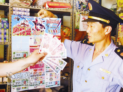 隨即,工商執(zhí)法人員趕到學校附近的幾家商店檢查,發(fā)現了小凱所說的這種兒童玩具。這種玩具是將人民幣圖案印在銅版紙上,并印有編號,形同真幣。整套玩具中夾帶兩本名為《奧運錢幣存折一本通》的游戲存折,其上印有賬號和北京奧運2008等字樣。