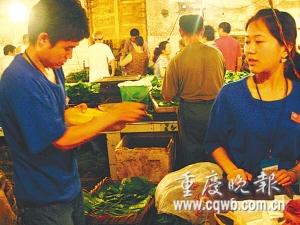 “愣在那兒干啥?吆喝幾句噻!”昨早7時(shí)30分,在模范村農(nóng)貿(mào)市場(chǎng)一菜攤,19歲的大一新生盛強(qiáng),拿著一捆小白菜,對(duì)身旁發(fā)呆的同學(xué)劉芳說(shuō)。盯著眼前一堆蔬菜看了老半天的劉芳,終于吆喝起來(lái)。