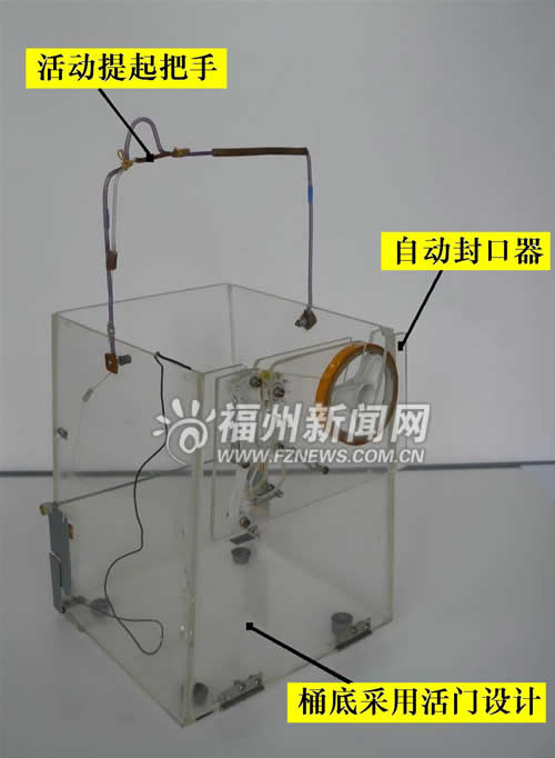 每次倒垃圾,都要先把垃圾從桶提出來,用手捆扎好后再丟棄。與垃圾的親密接觸以及垃圾袋的膨脹破裂,成了人們生活中難以避免的尷尬。福州教育學院的李昂同學發明了一種能自動封口,并從底部卸走垃圾袋的垃圾桶,巧妙地解決了倒垃圾的尷尬。