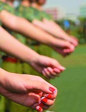 而從圖片中還可以看到,有的學(xué)生別出心裁地進行了美甲,有的則對短袖的軍訓(xùn)服裝進行改良——加裝了一對白色的袖套……