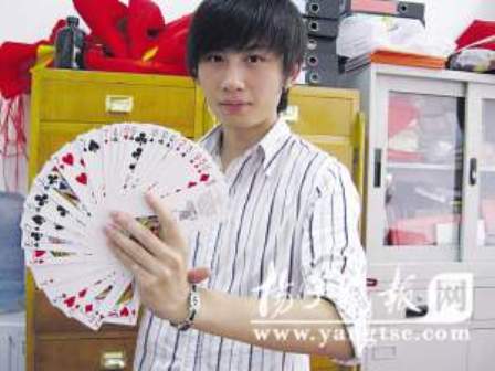 小王周圍的人都說他長相酷似劉謙,特別是“壞笑”時簡直是和劉謙一模一樣,同學(xué)們戲稱他“謙弟弟”。采訪中小王現(xiàn)場“秀”了幾手撲克牌魔術(shù),將記者“唬”得一愣一愣的,在場的老師和學(xué)生也都大呼“不可思議”。