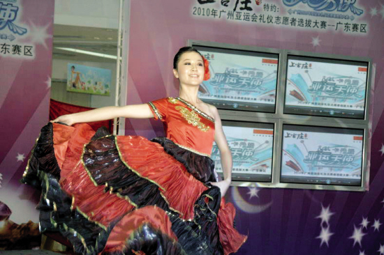“卡丹路亞運天使·廣州2010年亞運會禮儀志愿者選拔大賽”廣東賽區的首場晉級賽9月13日下午在廣州展開。廣州分賽區500多位報名參賽者中通過初步篩選的前30名選手,經過一番現場比拼后,最終有20名晉級廣東賽區“百強”。