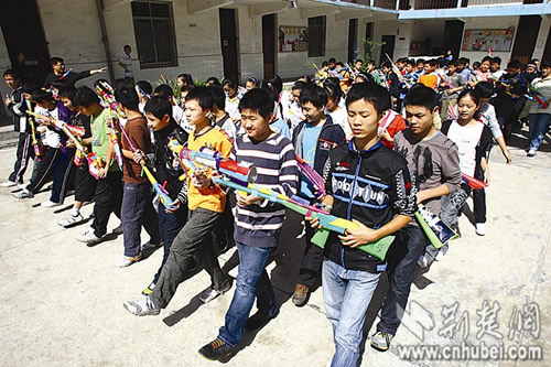 荊楚網(wǎng)消息 (楚天都市報(bào)) (記者張皓 攝影:記者魏錸)昨日下午,武漢市第59中學(xué)上百名學(xué)生,手持各式“槍支”在學(xué)校操場(chǎng)上走正步,體驗(yàn)“閱兵”的感覺。據(jù)介紹,該校最近嘗試新課改,將美術(shù)課與軍訓(xùn)、體育鍛煉結(jié)合進(jìn)行,這些槍支是在近兩個(gè)星期的美術(shù)課上,同學(xué)們利用紙盒等廢棄物自己動(dòng)手制作的。