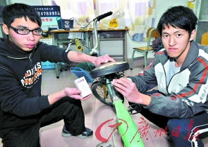 本報訊 (記者李立志 通訊員南宣)10來元錢的門鈴還有什么其他用途?南沙黃閣成人學校梁俊斌和張啟華手里拿著一個自行車的頭籃,一個自行車的座包,一個常見的家用門鈴,這就是“自行車防盜報警器”。他們經過三個多月的時間研制,發明了這個東西。在第25屆廣州市青少年科技創新大賽上,南沙區黃閣成人文化技術學校兩個農村的孩子發明創造作品《自行車防盜報警器》獲得了金獎。