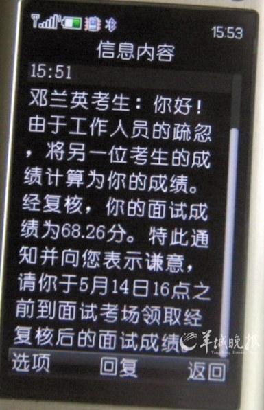 該負責人稱,得知此情況,他馬上叫一名姓蘇的工作人員電話告知鄧蘭英,告訴她剛才所發的成績通知書中,成績有誤,要求她返回考場更正。鄧聽后說,她已坐車在返回到徐聞的路上,該局人員于是承諾可支付其交通費,叫她速返回考場。但鄧不同意,最后,工作人員只好用手機13413633948(記者注:考場工作值班用的電話)發給鄧短信,對搞錯其成績一事表示抱歉并吩咐她于5月14日下午4時前到面試考場取經復核后的面試成績(注:鄧收到短信時間是5月12日16時47分)。