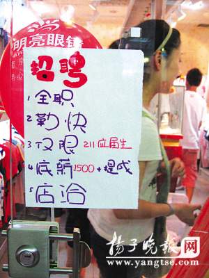 “招聘:全職,勤快,僅限211應屆生,底薪1500+提成,店洽”。這家名為“彩虹糖”的外貿服飾店門口貼出的招聘啟事20字左右卻沖擊力十足,其中“僅限211應屆生”部分還用紅色筆著重標出。