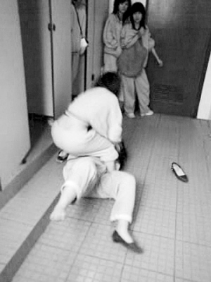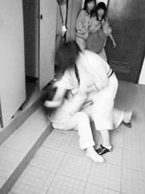殷瓊是上海西南工程學(xué)校一年級學(xué)生。4月16日下午,她參加考試,題目差不多做完了,同學(xué)小成對她耳語:“下課去校門口,有人找你談話。”殷瓊沒答應(yīng),小成幫她交卷,把她拉到校內(nèi)一幢大樓2樓女廁所門前,那里還有幾個女生在等著。拉扯進廁所后,另一名同學(xué)劉幸一邊拍她肩膀挑釁,一邊讓其他女生打開手機攝錄。視頻記錄了殷瓊的噩夢,殷瓊的母親向記者出示了這段影像:
