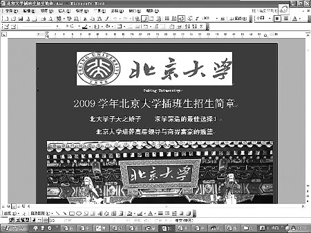 中凰天龍發(fā)來的招生簡章介紹說,北京大學(xué)插班生是指跟隨北京大學(xué)全日制本科生一塊學(xué)習(xí)、活動,僅是一次享受北大的文化氛圍,提升自身的知識水平的學(xué)習(xí)過程,畢業(yè)只頒發(fā)結(jié)業(yè)證,不屬于統(tǒng)招范疇。學(xué)生擁有聽課證,可以選擇專業(yè)跟讀。除了給招生代理公司交中間服務(wù)費(fèi)外,學(xué)生還要向?qū)W校交學(xué)費(fèi)7000元 /年、學(xué)雜費(fèi)3000元、床位費(fèi)500—600元/月等多項(xiàng)費(fèi)用。