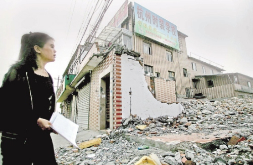 杭州彭埠鎮備塘路西邊是一大片廢墟,因為火車東站樞紐工程建設,這里大片房子都拆走了。廢墟中,卻有一幢四層樓孤零零地站著。很少有人知道,這是一所時裝學校,學校里至今還有100多人在上課。由于四周房子都拆走了,學校樓房墻壁上出現了裂縫,樓面也有些傾斜,玻璃窗也壞了。為什么學校遲遲不搬?接到讀者報料后,記者來到現場。