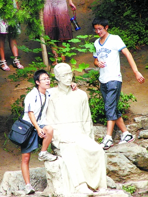 為了留下記憶,很多游客爭相和校園內的雕塑合影。“安坐”在荷塘一角的“朱自清先生”非常受青睞。有的游客和“老先生”勾肩搭背,更有甚者,直接坐在“老先生”腿上照相。