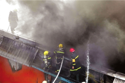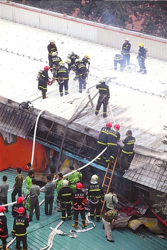 采石路消防中隊(duì)和首體南路消防中隊(duì)出動10輛消防車相繼趕到,消防員向屋頂噴水后,攀上樓頂鑿開屋頂彩鋼板向內(nèi)噴水。很快,明火被撲滅。消防員需一人指引進(jìn)入教室,小石便自告奮勇領(lǐng)路。小石說:“教室有一個籃球場大,里面有音響設(shè)備和椅子等物,當(dāng)時屋內(nèi)濃煙滾滾。”他隨即撤出,消防員繼續(xù)進(jìn)行撲救。
