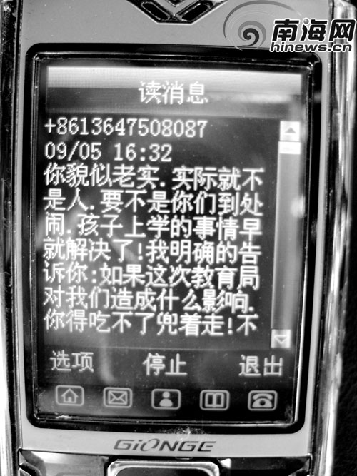 他們得知,曙光學校有兩名學生的分數超過了臨高中學的錄取分數線,卻不能上臨高中學,只能轉讀臨高二中,家長找曙光學校交涉,該校自知理虧,給兩名學生各賠了2000元。于是,他們幾人也找到曙光學校校長王文進,要求退錢。對方非但沒退錢,反而發短信辱罵了他。