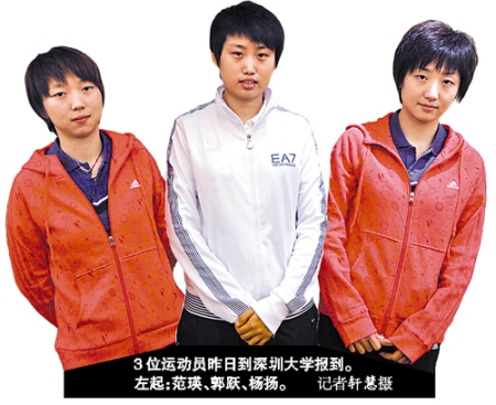 本報訊(記者張瑩 通訊員邱妙芳)昨天晚上,郭躍、范瑛和楊揚三位運動員從深圳大學校長章必功手中接過深大頒發的學生證。