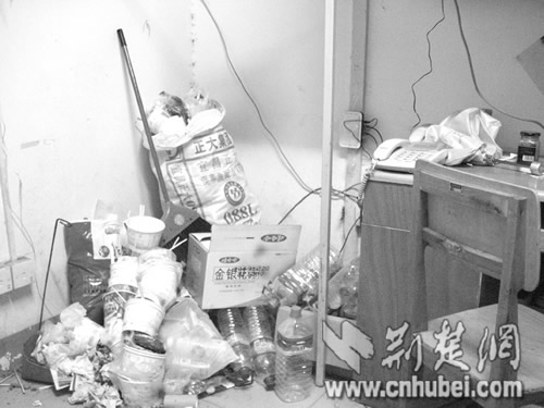 據記者了解,B棟所住的均為該校的男大學生。這行粉筆字寫在樓道的地上,記者趕到時,字跡已經十分模糊了。在知情學生的指引下,記者進入6樓一間寢室。一進門,一陣怪味就撲面而來。四下仔細一看,寢室門后一個高近一米的垃圾堆赫然出現在記者眼前:用過的飯盒、塑料袋,甚至是煙頭、飲料瓶,各式垃圾堆滿一地。但在這種環境下,寢室里的4個男生卻好像絲毫沒有察覺,上網、看書不亦樂乎。該寢室學生小程告訴記者,他們每天的學習任務都比較重,課余時間一些同學又流連網絡,因此大家平時都不愿意做清潔,寢室里形成這么個垃圾堆也“不足為奇”。“不過通常我們隔一個月會清除一次的。”小程說,冬天把垃圾堆在寢室里也沒多大關系,夏天會清除得比較及時。而小程所說的“清除”,就是把垃圾從室內掃到寢室門口堆放,等宿管做清潔的時候一并清理。“其實我們的生活垃圾是應該自己拿到樓下的垃圾桶里扔掉的,但很多同學為了省事,就直接把垃圾堆在門口,這樣增加了宿管做清潔的勞動量,最后才發生了她們寫‘大字’抱怨的事情。”