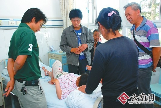 事情過去快一周了,但躺在玉溪市人民醫院病床上的斌斌(化名)和席席(化名)臉上還有明顯的燒傷痕跡。斌斌的傷情是在所有傷者中最嚴重的,被火燒到臉部和手部以后,他還去水龍頭下洗了頭,結果把臉上和手上的一大塊皮都抹了下來。